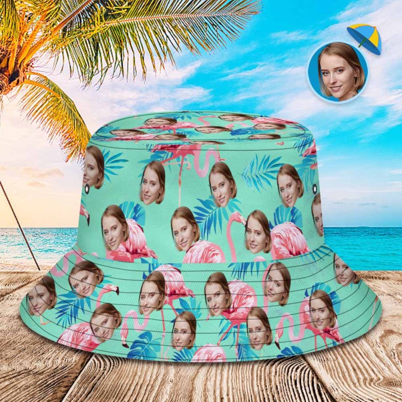 Benutzerdefinierter Gesichts-flamingo-flamingo-tropenhut Mit Allover-print In Grün Und Palmblättern