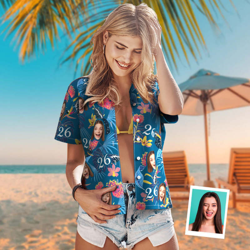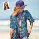 Hawaiihemd Mit Individuellem Gesicht, Hawaiihemd Mit Nummer Und Gesicht, Dunkelblauen Ärmeln Und Rosa Blumen, Geschenk Für Frauen