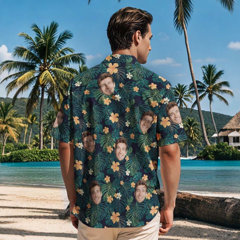 Dieses Hawaiihemd verfügt über einen Aufdruck, einen Knopfverschluss und kurze Ärmel.