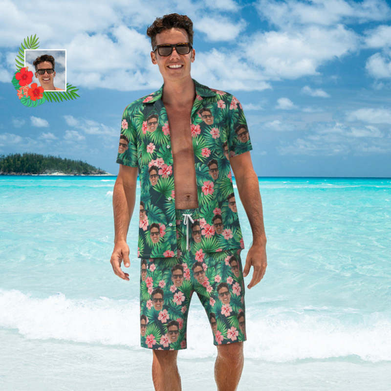Benutzerdefiniertes Mit Hawaiihemd Und Strandshorts Mit Gesicht, Blättern Und Blumen, Personalisiertes Herrenfoto-allover-print Urlaubsparty-geschenk