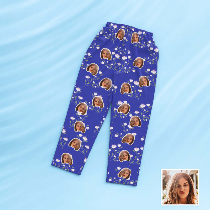 Benutzerdefiniertes Gesicht Langarm-button-down-nachtwäsche, Personalisiertes Foto, Blauer Pyjama, Blumen, Geschenk Für Freunde