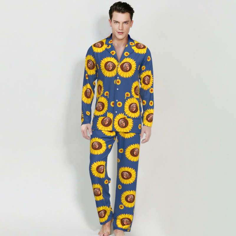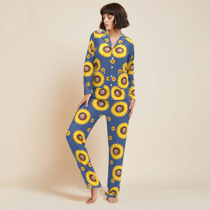 Benutzerdefiniertes Gesicht Langarm-button-down-nachtwäsche, Personalisiertes Foto, Blauer Pyjama, Sonnenblumen, Geschenk Für Freunde