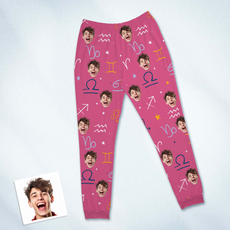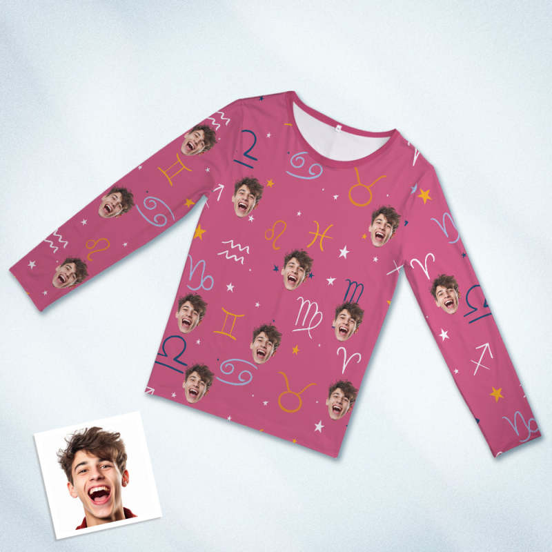 Benutzerdefinierte Gesichts-pyjama-nachtwäsche, Personalisierter Rundhals-rosa-pyjama, Sternbild-symbol Für Frauen