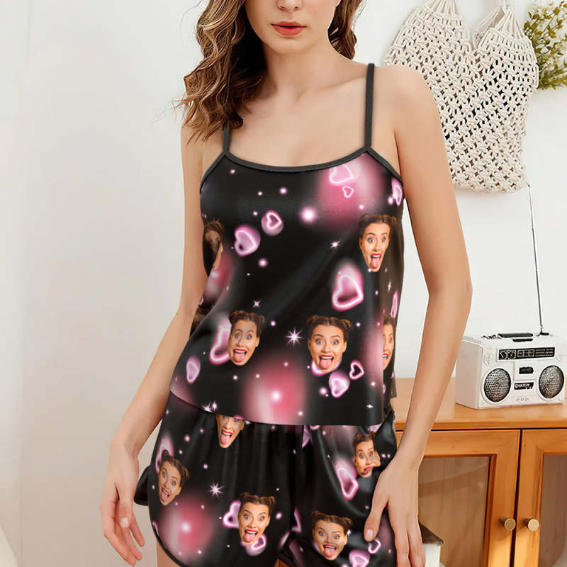Benutzerdefinierte Gesicht Pyjamas Straps Schlafanzug Shorts Dessous Set Sommer Nachtwäsche mit Allover Herz
