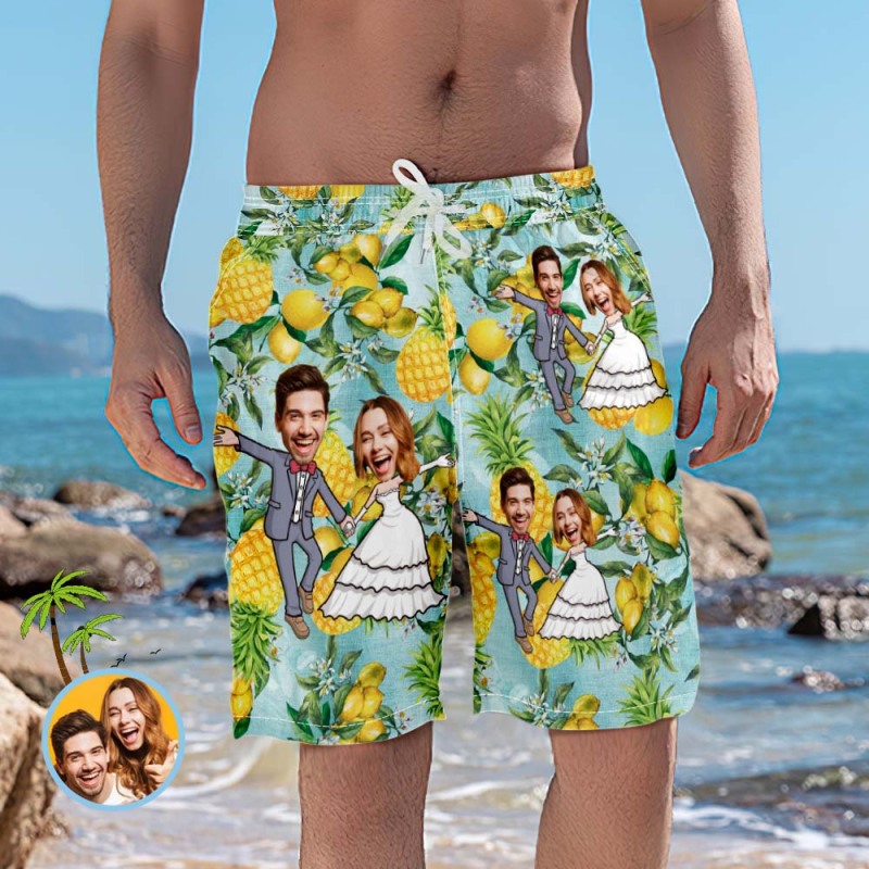 Custom Wedding Beach Shorts Funny Pineapple Couple Face Swim Trunks Custom Wedding Beach Shorts Funny Pineapple Couple Face Swim Trunks