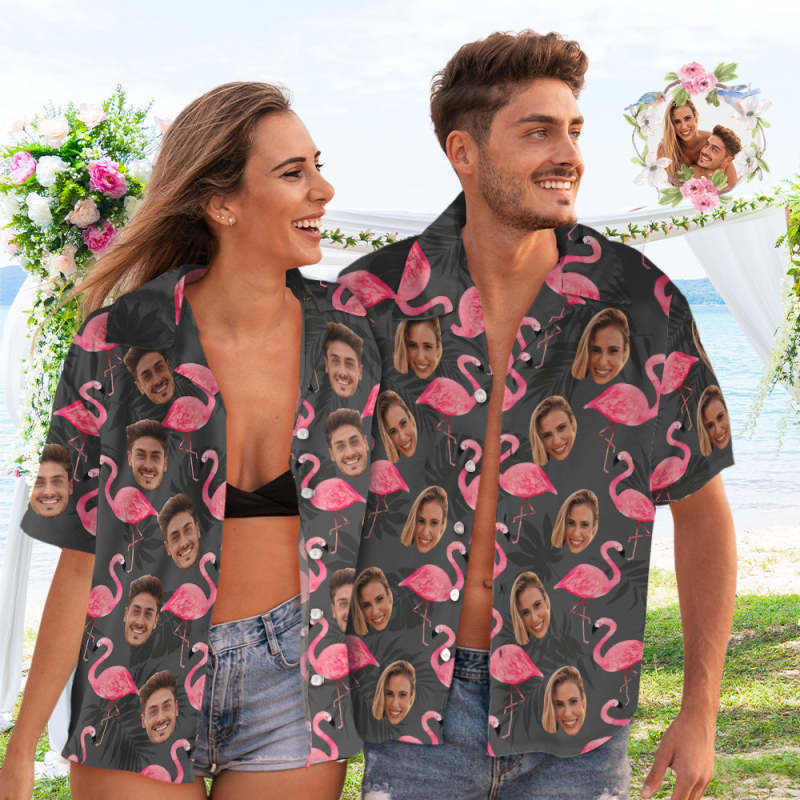 Passende Hawaii-hemden Für Paare Mit Individuellem Gesicht, Flamingo- Und Monstera-blätter, Valentinstagsgeschenk Hochzeitstag